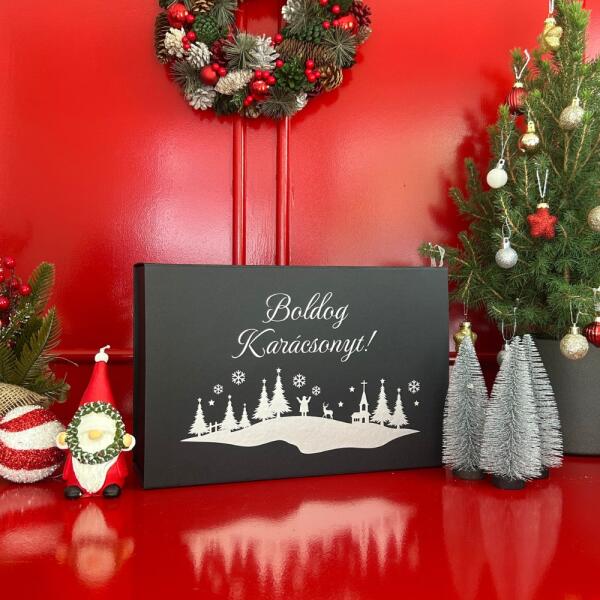 Idén valami különleges karácsonyi csomagolást szeretnél? Íme egy elbűvölő karácsonyi ajándékdoboz, melyen elegáns, ezüst karácsonyi minta található. Kiemelkedő Minőség: A karácsonyi ajándékdoboz a minőség és a részletek iránti elkötelezettség jegyében készült. A tartós és vastag fekete karton anyag tartósságot biztosít, így az ajándék biztonságban és tökéletes állapotban marad az ünnepek során. A mágneszárral ellátott fedél megakadályozza az ajándék véletlen kinyílását, így az mindvégig meglepetés marad. Elegáns Design: A fekete és az arany kombinációja örökzöld eleganciát kölcsönöz a karácsonyi ajándékdoboznak. Az arany "Boldog Karácsonyt" felirat ragyogóan kiemelkedik a fekete háttérből, és az ünnepi hangulatot tárja elénk. Ajándékdoboz tulajdonságokKiváló minőségű mágneses doboz karton papírból (1200 g/m)A mágneszárakkal csukódó dobozTökéletes megoldás ajándék és termék csomagoláshoz is, valamint tároló dobozként is jól funkcionálTeljes egészében újrahasznosított kartonpapírból készült és 100%-ban újrahasznosíthatóKarácsonyi ajándékdoboz más méretben? A fenti grafika megvalósítható más méretű, fekete díszdobozokon is. Ehhez kérjük vedd fel velünk a kapcsolatot az elérhetőségeink egyikén. Exkluzív ajándékozási élmény A mágneses zárak rendkívül elegáns megjelenést biztosítanak az ajándékdoboznak. Míg sok más doboz esetén a záródást plusz szárnyakkal vagy fedéllel oldják meg, addig a mágneses dobozok esetén a mágnesek jóformán észrevétlenek maradnak – elrejtve találhatóak a perem és a fedél karton anyagában. Ennek köszönhetően a doboz felnyitása és bezárása is különleges élményt nyújt, hiszen a fedél könnyedén rásimul a doboz szélére, mely által tökéletes záródást biztosít. A doboz bezárásakor a mágnesek összekapcsolódásával egy apró hangot is hallunk, ami még varázslatosabbá teszi a díszdobozt. Lapra szerelt forma Több ajándékdoboz rendelése esetén lapra szerelt formában kerülnek kiszállításra az ajándékdobozok.