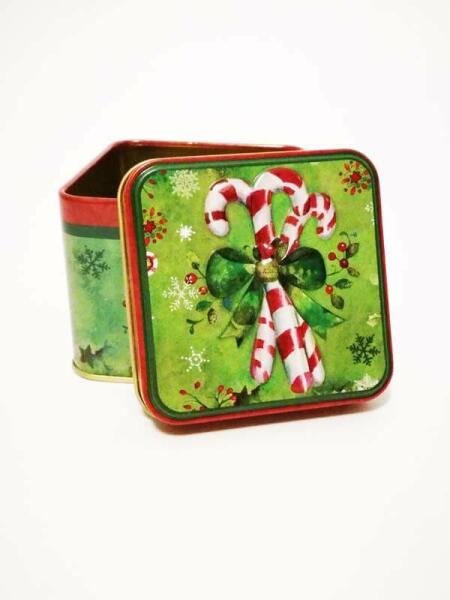 Négyzet alakú fémdoboz, klasszikus karácsonyi mintával.